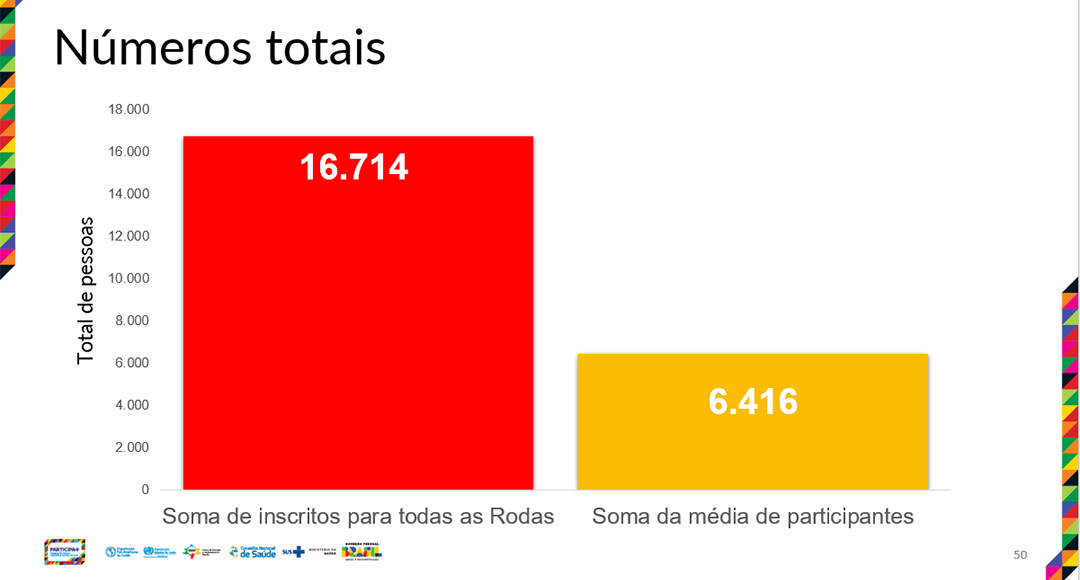 O público participante realizou inscrição individual prévia, sendo composto tanto por pessoas que participaram das Oficinas de Formação, quanto por usuários do SUS em geral. As Rodas de Conversa foram realizadas em formato virtual, garantindo maior acessibilidade e abrangência. Em média, a participação foi de 58 pessoas em cada roda, em encontros com duração de aproximadamente duas horas. Segundo dados compilados do Projeto, mais de 16 mil pessoas se inscreveram para participar das rodas, tendo 6.416 pessoas ingressado nas atividades e permanecido por maior tempo.